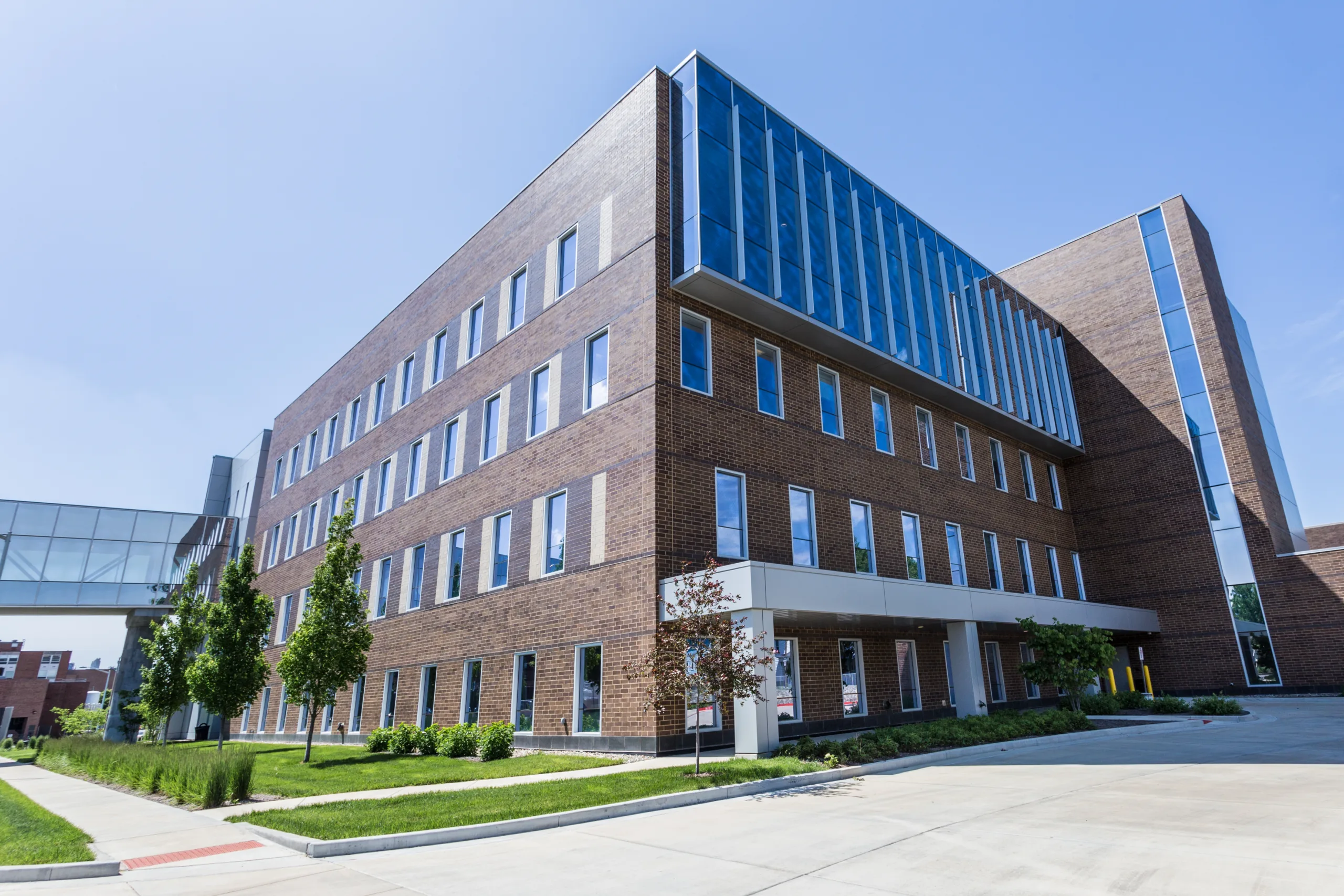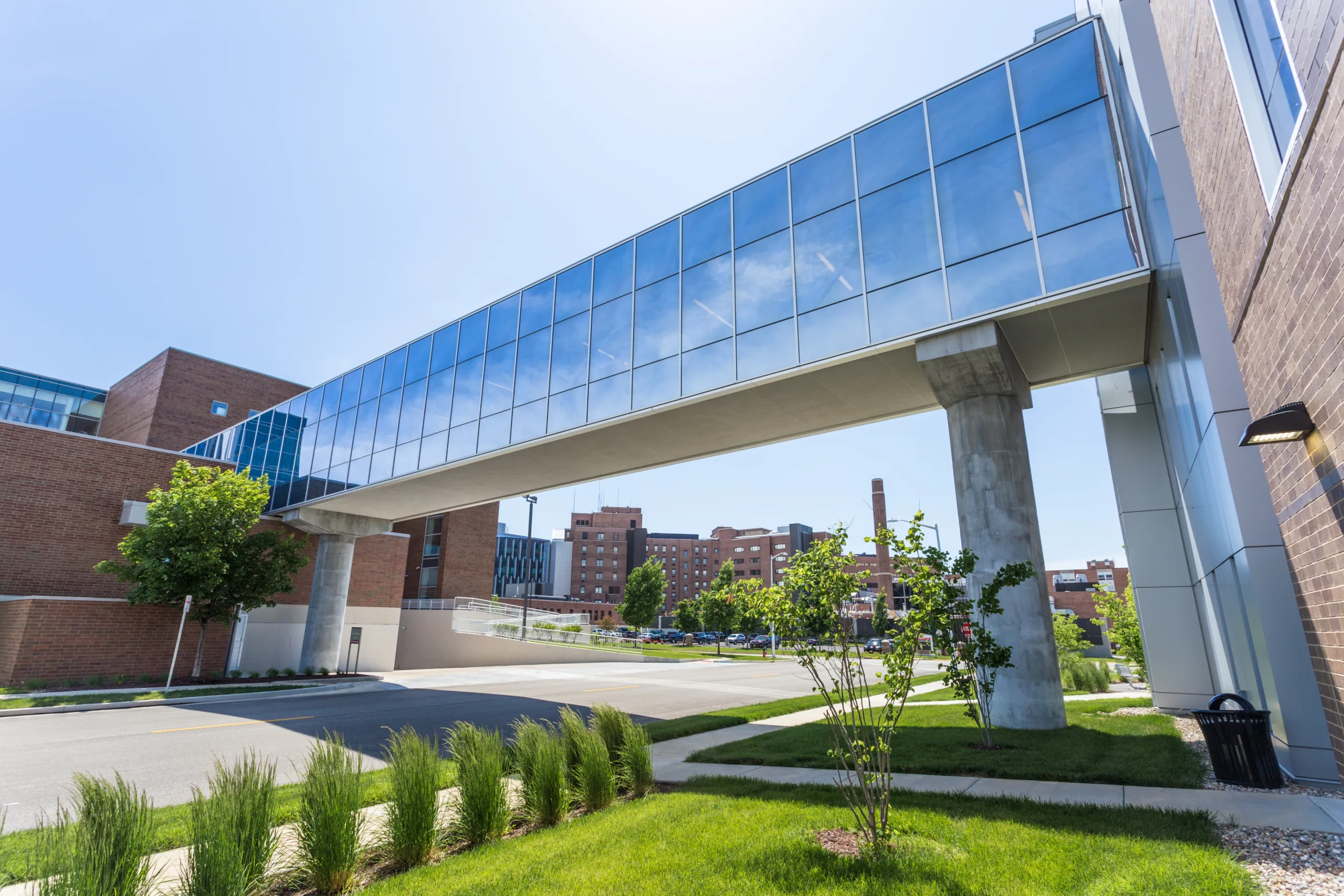 The centerpiece of the facility’s design, a 15,000-square-foot, three-story air-rights office area that spans Springfield’s busy four-lane Sixth Street, connects the new expansion to the clinic’s original facility. Structural engineers selected composite bar joists for the structural system to protect the building against a disproportionate collapse if a vehicle impact occurred. They also offered a relatively simple erection sequence that minimized the disruption to motorists traveling through the construction zone into downtown Springfield. In addition, engineers designed the long-span structure to minimize the impact of vibration frequency and amplitude on the clinic’s exam and waiting rooms located on the bridge structure.