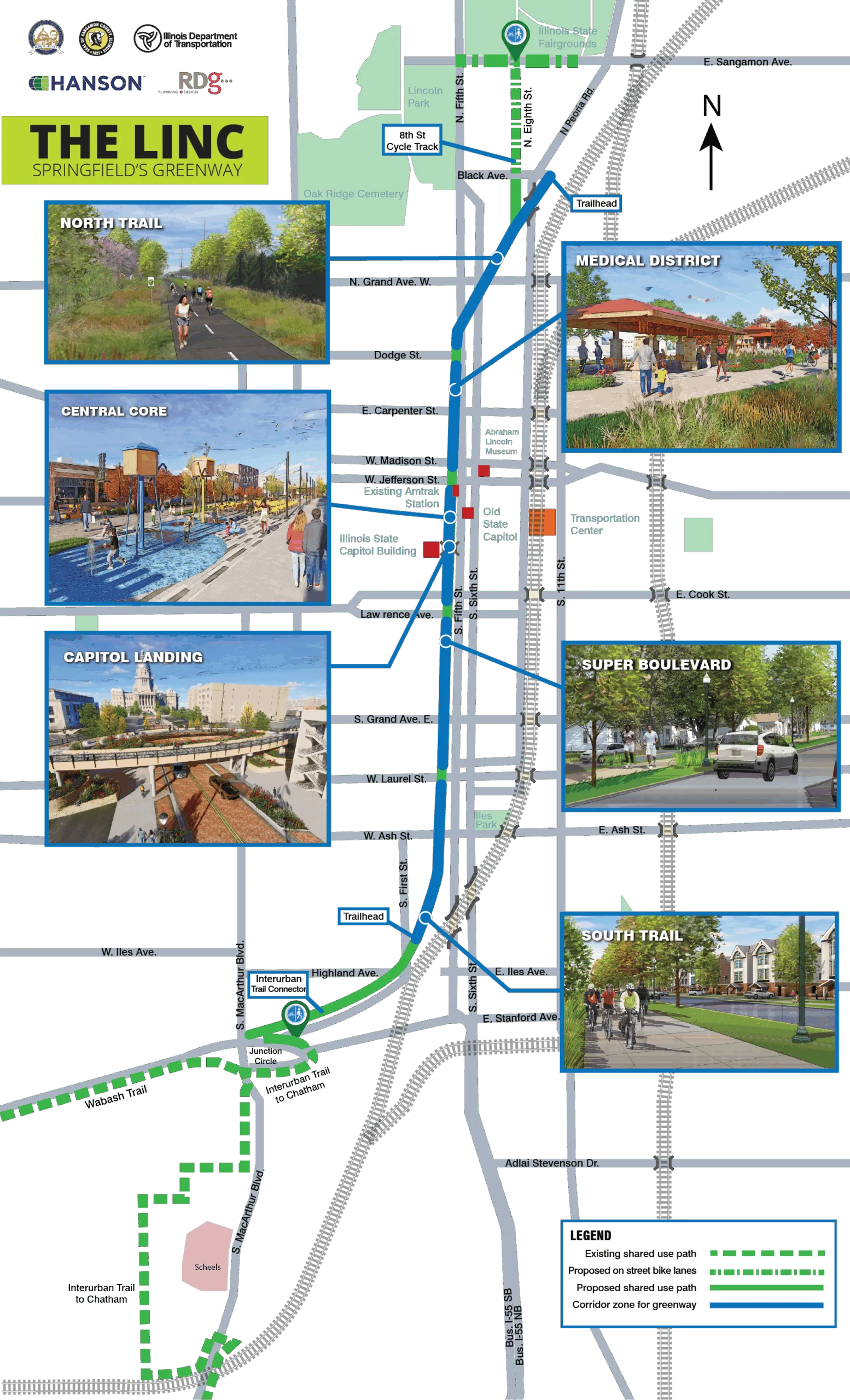 Hanson, which has provided design engineering, program management and construction support services for the rail relocation, also prepared a feasibility study for the Third Street development and has started Phase I environmental planning. The limit of the feasibility study from south to north is from the Interurban Trail at Stanford Avenue to an entrance at the southern edge of the Illinois State Fairgrounds. Hanson prepared conceptual plans for the corridor, illustrating the multiuse trail connection.