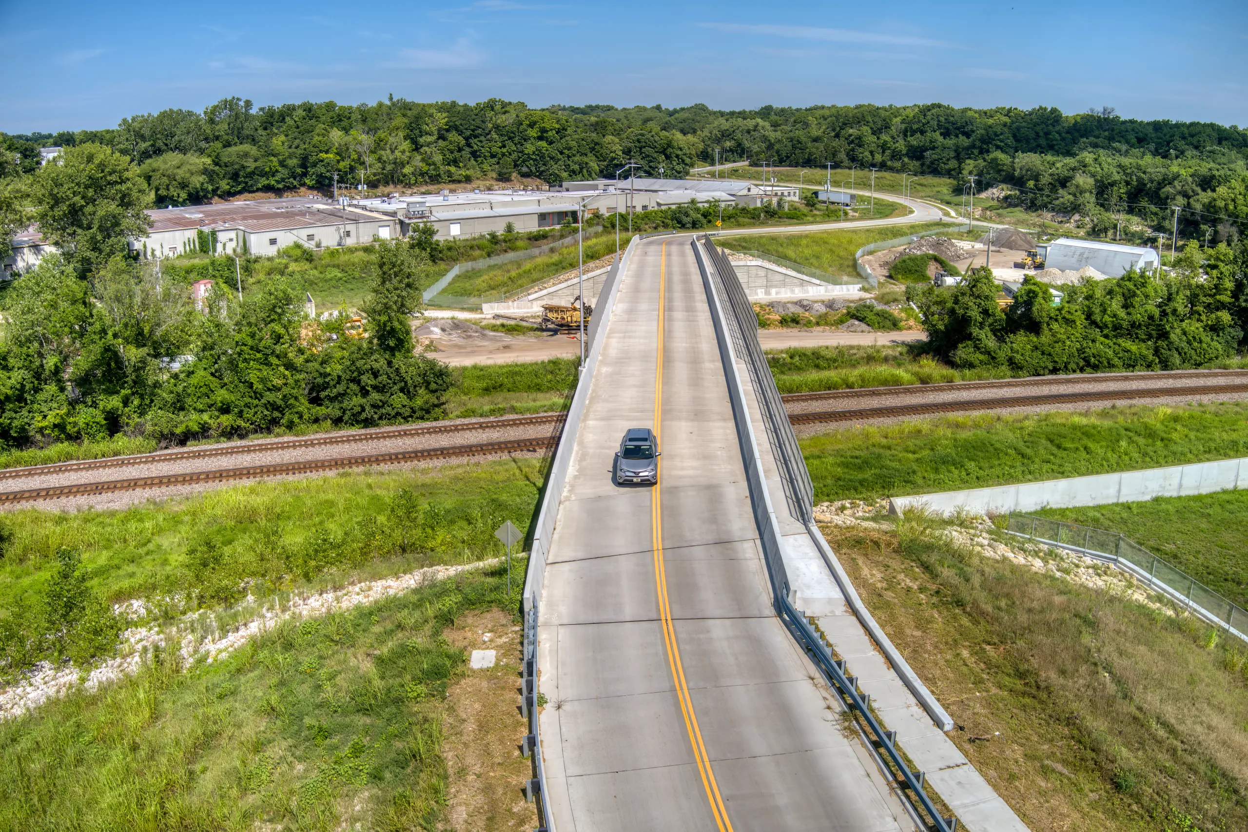 The Swope Park Industrial Area Flyover Bridge project marks the culmination of efforts initiated in the 1990s, representing a transformative milestone for the region. Flooding and access issues plagued the Swope Park Industrial Area in Kansas City, Missouri, for many years. Home to approximately 400 jobs, its proximity to the Blue River often exposed it to storm surges, and the railroad crossing at 75th Street, the only road into the area, meant that employees and emergency personnel were frequently blocked from passage by long-running or stopped trains. The city knew it needed a solution to sustain the critical businesses in the busy development.
